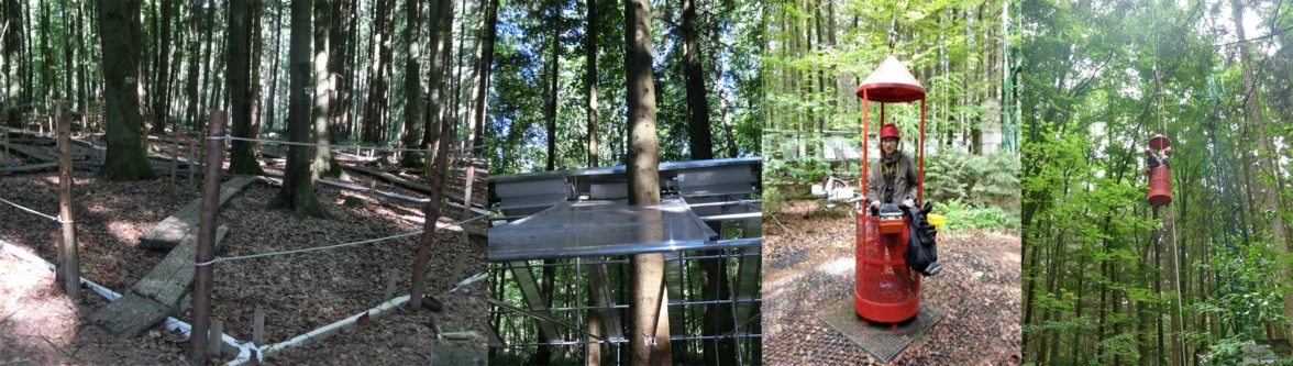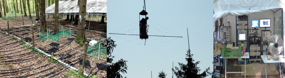 Auf der Versuchsfläche im Kranzberger Forst wurden 12 Parzellen mit adulten Buchen und Fichten etabliert. Sechs Parzellen wurden mit automatisch verschließbaren Dächern zum Regenausschluss ausgestattet. Im Zeitraum 2014-2018 wurden die Auswirkungen einer langanhaltenden Trockenheit auf ausgewachsene Buchen und Fichten im Vergleich zu Kontrollbäumen untersucht.