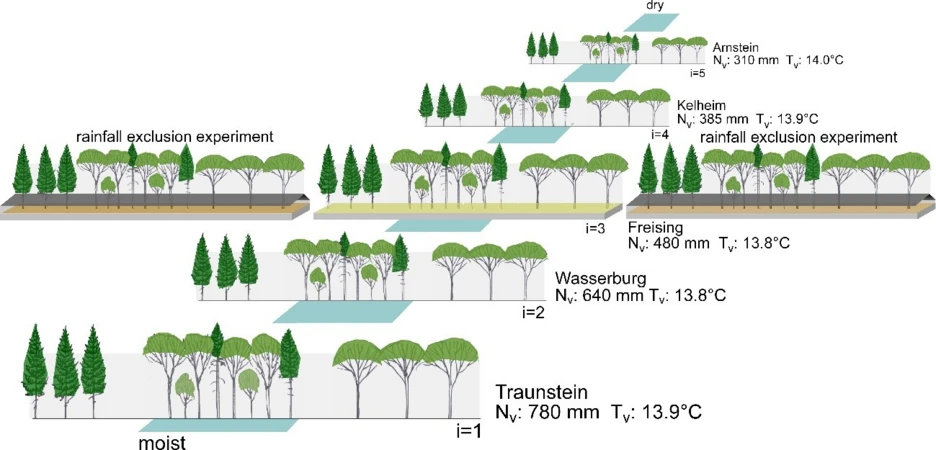 „Kroof-gradient“, das ist ein Versuchsflächen-Transekt auf bayerischen Waldstandorten mit unterschiedlichen Niederschlagssummen