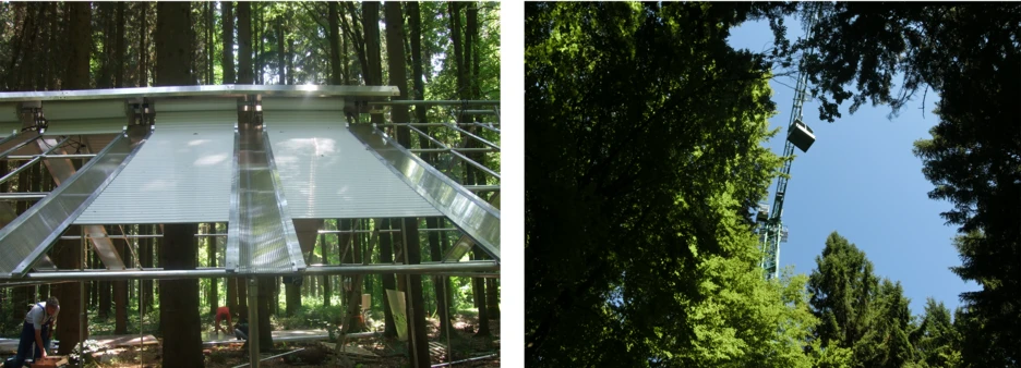 In Mitteleuropa sind Fichte (Picea abies [L.] KARST.) und Rotbuche (Fagus sylvatica L.) mit einem Anteil von 30 % der Waldflächen die dominierenden Wirtschaftsbaumarten (Pretzsch et al. 2014). Um die Reaktion dieser beiden Baumarten auf eine langfristige und wiederholte Trockenheit in Monokulturen und Mischpflanzungen aufzuklären, wurde 2013 das „Kranzberg Forest Roof Project“ (Kroof) initiiert, gefördert von der Deutschen Forschungsgemeinschaft (DFG) sowie vom Bayerischen Staatsministerium für Ernährung, Landwirtschaft und Forsten und dem Bayerischen Staatsministerium für Umwelt und Verbraucherschutz.
